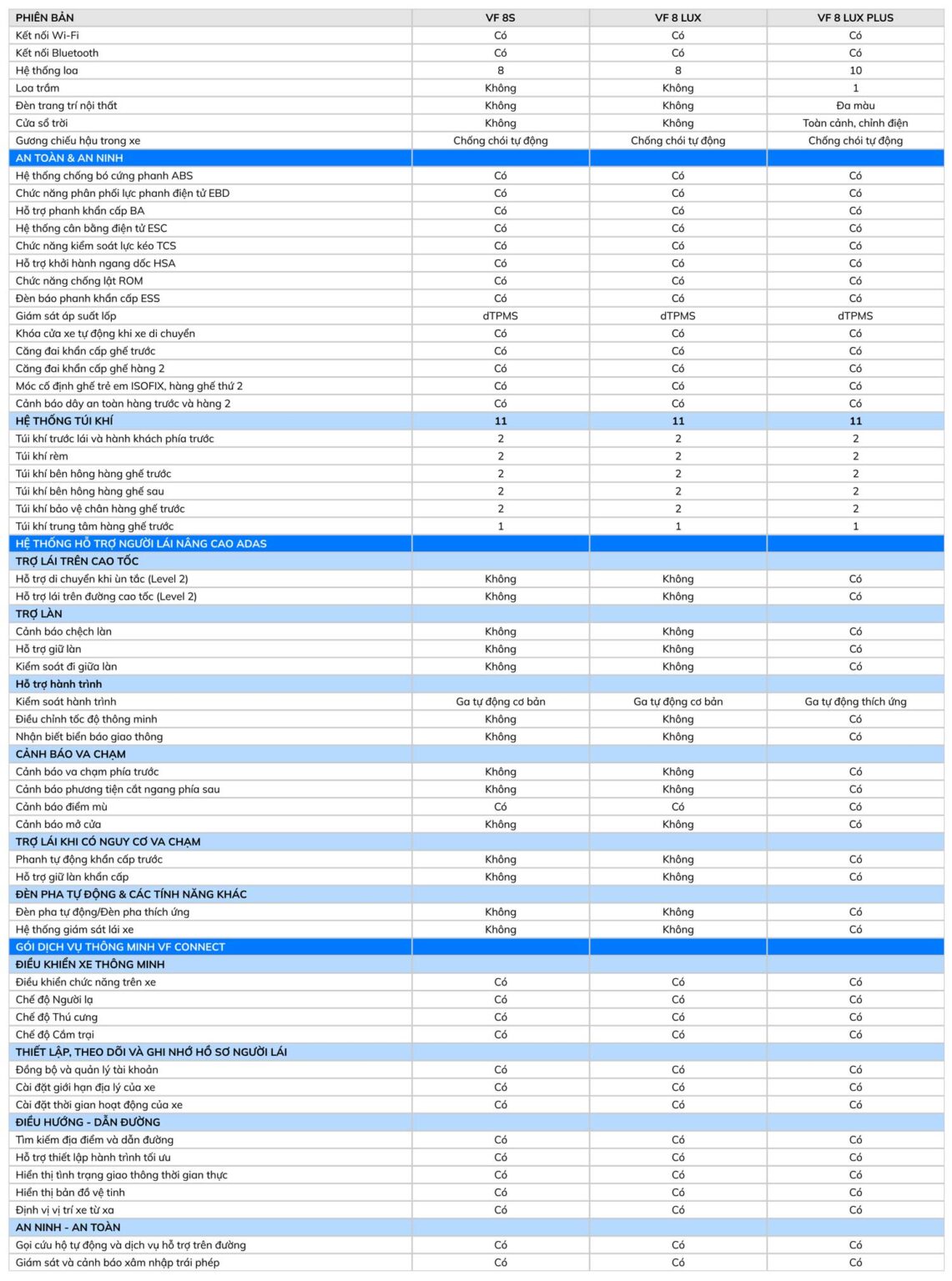 VinFast VF 8 Lux với thiết kế mới sang trọng và công nghệ vượt trội. Với nhiều điểm nổi bật: ngoại thất hai tông màu, công nghệ trợ lý ảo Vivi 2.0 mới, ADAS và VF Connect. VinFast VF 8 Lux có hai tùy chọn là phiên bản thường và phiên bản Plus, trong đó phiên bản VF 8 Lux được trang bị động cơ điện có công suất 350 mã lực, đi được quãng đường 471km/lần sạc đầy, trong khi phiên bản VF 8 Lux Plus có sức mạnh lên tới 402 mã lực, đi được quãng đường 457km/lần sạc đầy.
